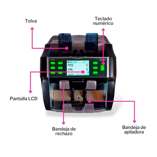 Esto asegura una operación confiable y segura, incluso en entornos donde la autenticidad del dinero es crucial.Equipada con una impresora térmica para generar reportes detallados y una pantalla LCD de 3.5 pulgadas que proporciona una interfaz intuitiva y fácil de usar, la SAT BC5120 permite configuraciones rápidas y precisas según las necesidades del usuario.